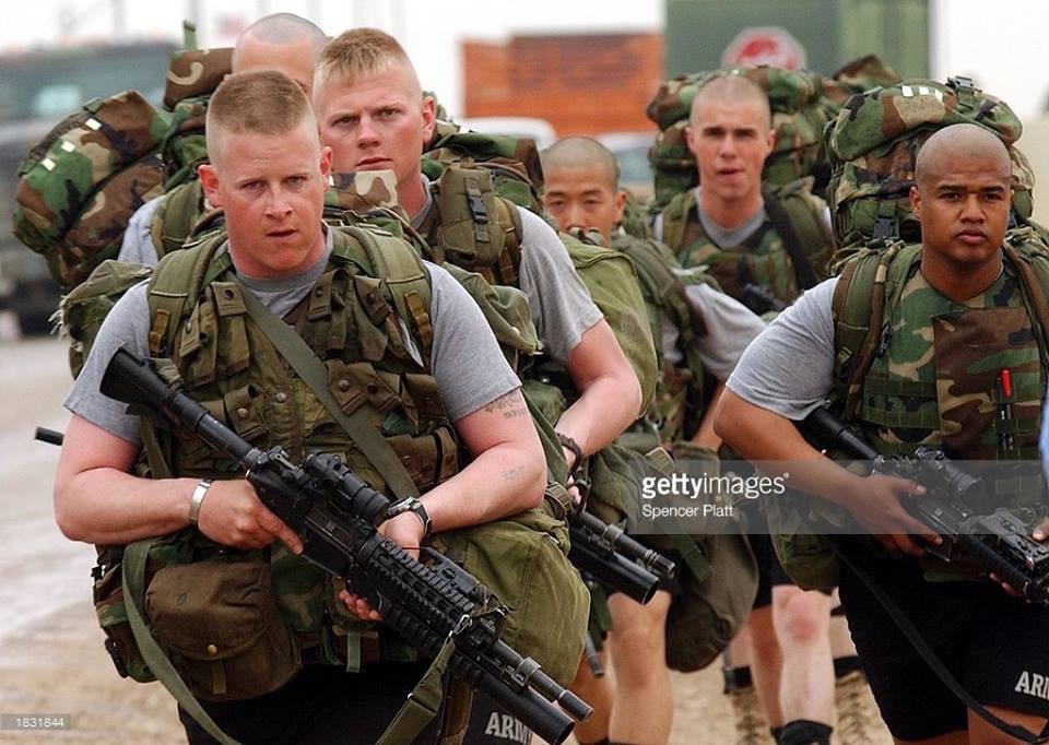 In this timeframe soldiers had mixture of new and old equipment system as US. Military had started transitioning from ALICE or LC-2 which was issued since 70’s and at time, new MOLLE equipment. He is wearing a JLIST (or known as MOPP) suit over his standard Desert Combat Uniform with leg pouch containing gas mask in an event Chemical (WMD) attack occurs.