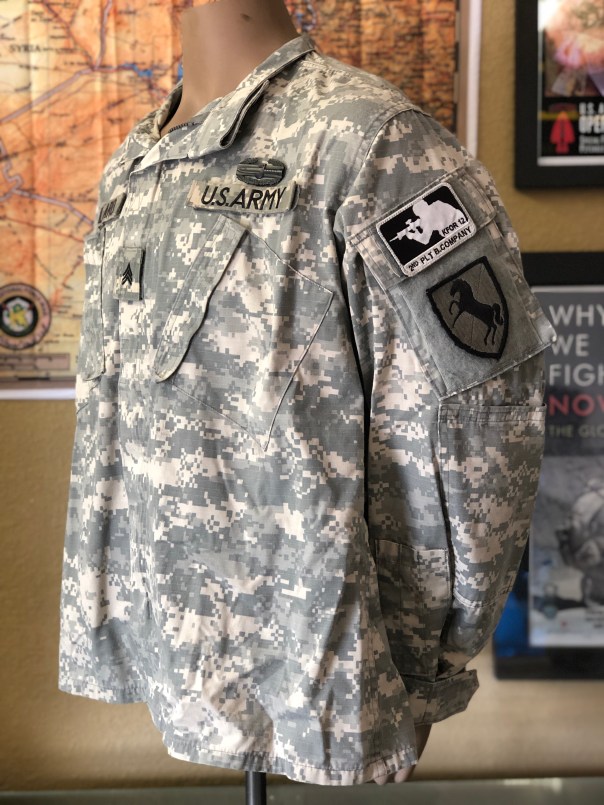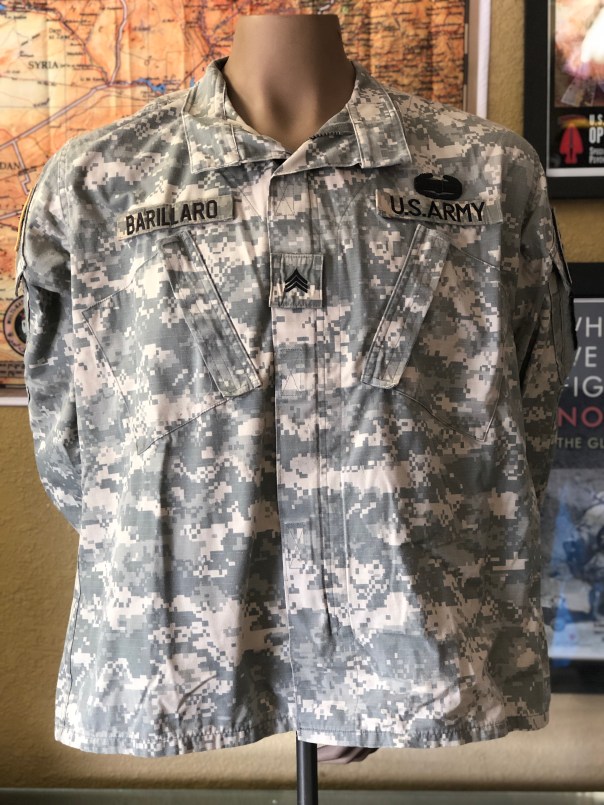 Here is the ACU uniform set belonging to Barillaro. He had worn it in Iraq and then Kosovo. On it is a unofficial/unauthorized Kosovo deployment patch from his unit. It has the Combat Action Badge and Combat patch he earned in Iraq. There are also a few of his desert patches fixed on velcro for his modified Desert Combat Uniforms also worn in Iraq just before the transition to the new ACU. Note the helmet cat eye elastic band that he has taken off from his issued ACH.