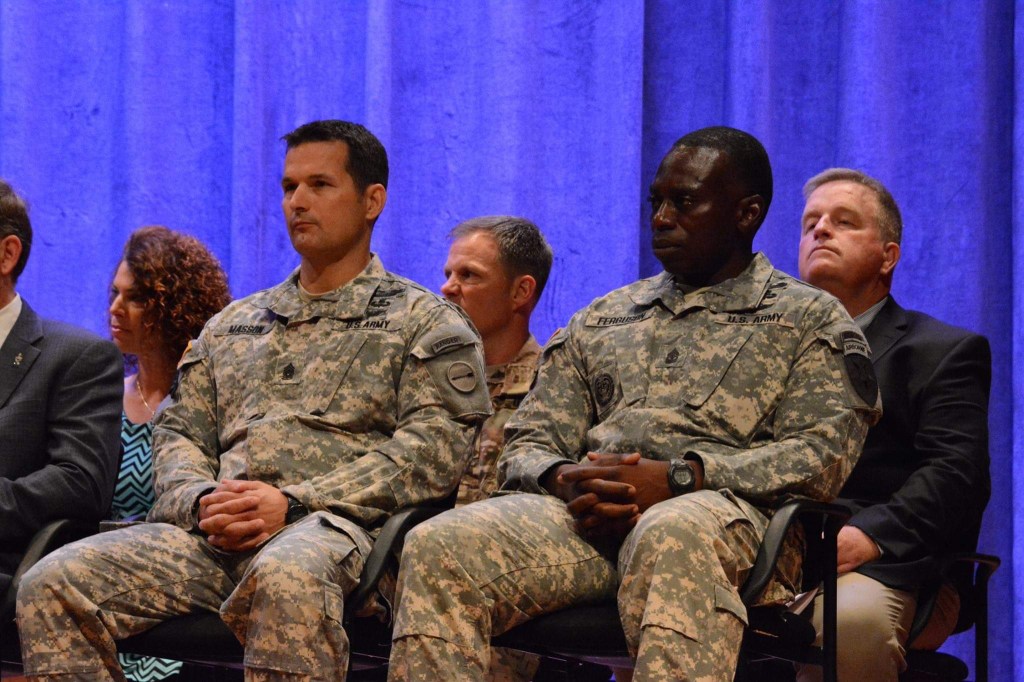 Command Sgt. Maj. Michael Masson, Asymmetric Warfare Group ABLE Squadron command sergeant major and former Regimental Special Troops Battalion command sergeant major; and Sgt. Maj. Harry Ferguson, 1st Joint Communications Squadron Joint Communication Support Element (Airborne) and former Regimental Signal sergeant major, during the 2015 DHMOR ceremony at US Army Fort Benning, 23 June.
