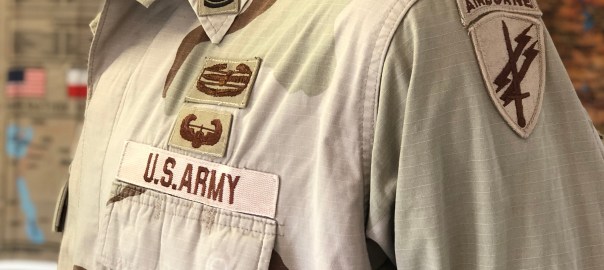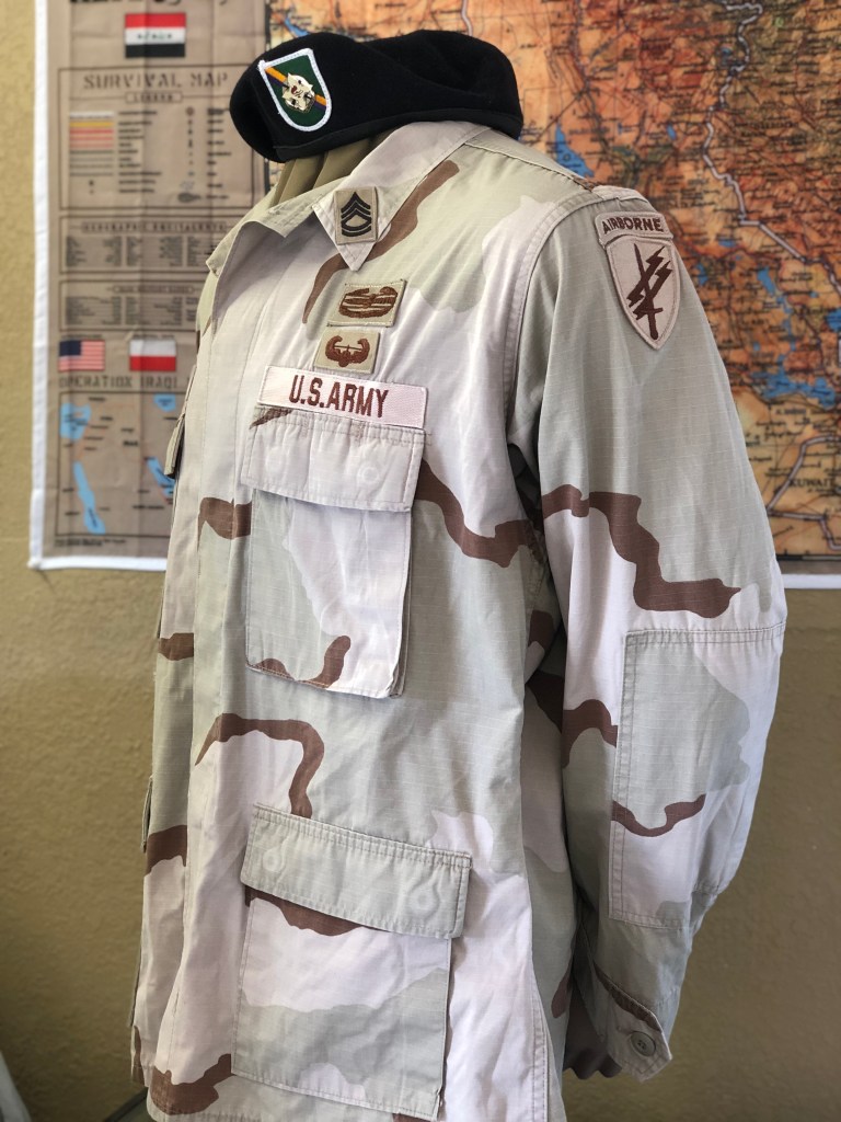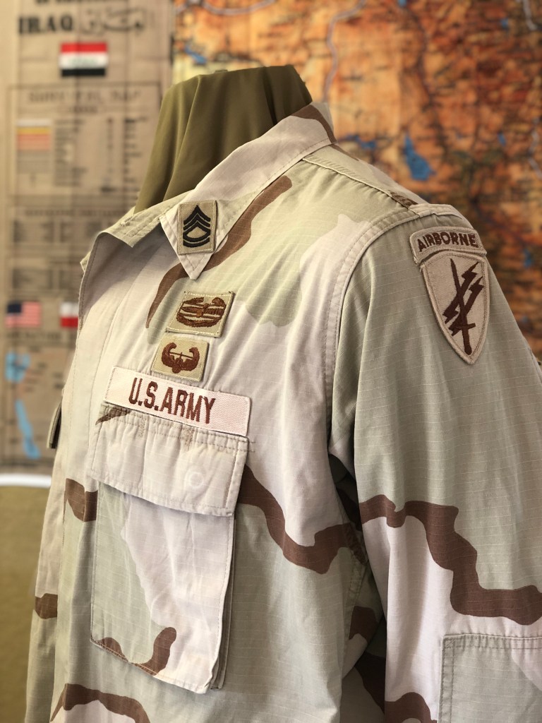 The Desert Combat Uniform (DCU) and beret belonged to SFC Shawn McElravy, who was NCO (Non-Commissioned Officer) in charge of the 1290th Psychological detachment. The detachment was made up of men from 361st Psychological Company. The 361st is part of the US. Army reserve unit, 12th Psychology Operations Battalion. The unit was activated in 2003 then deployed to Mosul, Iraq in 2004-05 to support the 25th Infantry Division’s Stryker brigade. The detachment provided valuable support: Information war. The detachment would utilize press equipment such as large printers and heavy duty industrial paper cutting machine, with capabilities of printing flyers, airdrop leaflets, and posters. They also utilized various tools including but not limited to, broadcast equipment and loudspeakers. They used any tools that would enable them to deliver the information to local populations. More information, details, and images can be found here: http://www.psywarrior.com/361stPsyopIraq.html