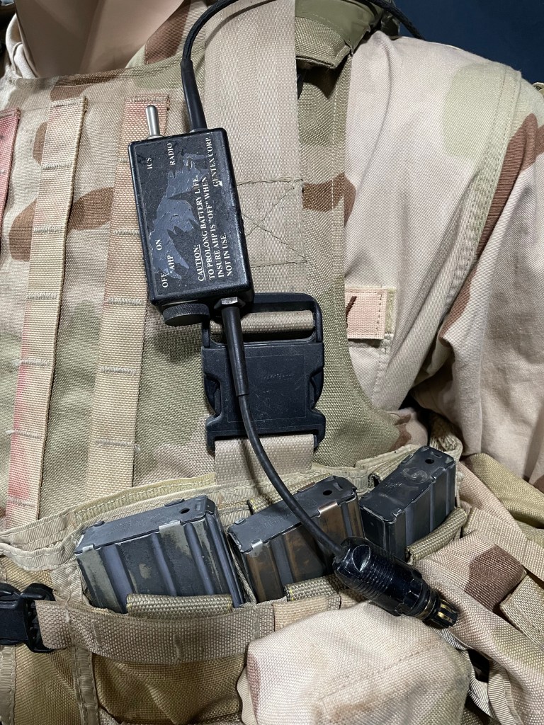 Another equipment to highlight: Hellcat MK2 chest rig made by SO Tech. At the time, chest rigs weren’t widely issued so those had to be bought out of pocket. The chest rig has early “yellowish” tan material as well “seatbelt” straps. The chest rig was innovative and cutting edge for its time as it has pockets for magazines built in to make it easy and quick to draw. Standard issue desert pouches from MOLLE equipment mounted on it for additional ammo and gear. The chest rig is worn over Safariland SPEAR body armor.