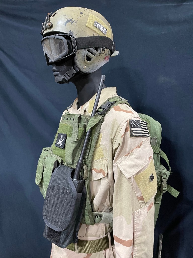Blood types on Velcro. Goggles are strapped onto helmet via 550 cords. Notes: The black pouch is for HABD (Helicopter Aircrew Breathing Device), essentially mini oxygen cylinder for emergency during maritime operations. the glow stick affixed to the helmet may have been used for friendly/for identification during a nighttime raid. Merrell Sawtooth- Special Operations community’s favorite private purchase boots. Central Command Area of Responsibility (May 24, 2003) — SEAL (Sea, Air and Land) Team members board Joint Venture, High Speed Vessel Experimental One (HSV X1) for a Visit, Board, Search, and Seizure (VBSS) training evolution by fast roping from an HH-60H Sea Hawk helicopter assigned to the ÒIndiansÓ of Helicopter Anti-Submarine Squadron Six (HS-6). SEAL Team members conduct various training evolutions with Joint Venture and are both deployed to the Central Command Area of Responsibility in support of Operation Iraqi Freedom. Operation Iraqi Freedom is the multi-national coalition effort to liberate the Iraqi people, eliminate Iraq’s weapons of mass destruction, and end the regime of Saddam Hussein. U.S. Navy photo by Photographer’s Mate 2nd Class Michael J. Pusnik, Jr. (RELEASED) A photo of SEAL in Iraq with similar set up as the display. Image Source and full context are unknown. Found in open source.