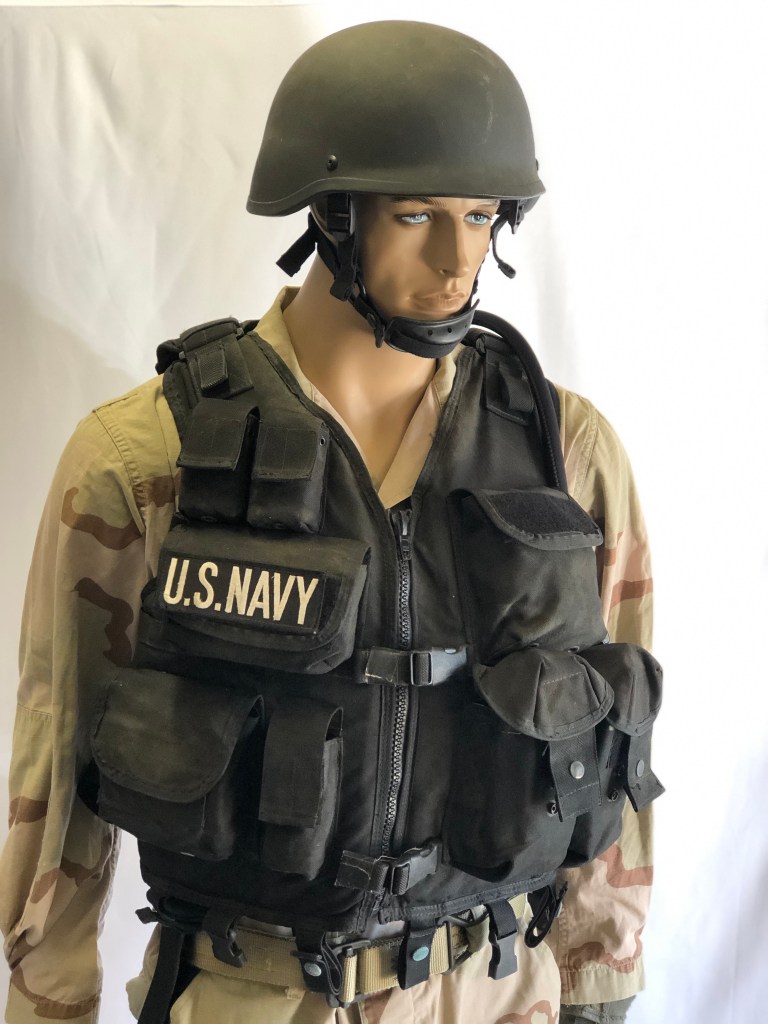 The tactical flotation vest made by London Bridge Trading, various of pouches for ammo, first aid kit, and other essential pieces of equipment. This vest doesn’t have any ballistic protection. The newer version of flotation vest would have soft armor and hard plates (Not shown).The back of vest has pouches for hydro-bladder and radio. RBR F6 Combat helmet. The typical helmet of US. Navy VBSS in early GWOT. At sea aboard USS Lake Champlain (CG 57) Jan. 15, 2002 — The leader of the Vessel Boarding Search and Seizure (VBSS) team from aboard USS Lake Champlain gives the operation briefing before conducting a search of a merchant vessel. Maritime Interception Operations (MIO) are being conducted by the U.S. Navy in cooperation with coalition ships in support of Operation Enduring Freedom. U.S. Navy Photo by Photographer’s Mate 1st Class Greg Messier. (Image courtesy of Navy https://www.navy.mil/view_image.asp?id=620)The Arabian Gulf (Mar. 21, 2003) — A Vessel, Board, Search and Seizure (VBSS) team member inspects camouflaged mines hidden inside oil barrels on the deck of an Iraqi shipping barge. The shipping barge was intercepted and inspected by Coalition Maritime Interdiction Operation (MIO) and Vessel Board Search and Seizure (VBSS) teams from the patrol craft USS Chinook (PC 9) in the early hours of Operation Iraqi Freedom. Operation Iraqi Freedom is the multi-national coalition effort to liberate the Iraqi people, eliminate Iraqs weapons of mass destruction and end the regime of Saddam Hussein. U.S. Navy photo by Photographers Mate 2nd Class Richard Moore. (Image courtesy of Navy. https://www.navy.mil/view_image.asp?id=6036)